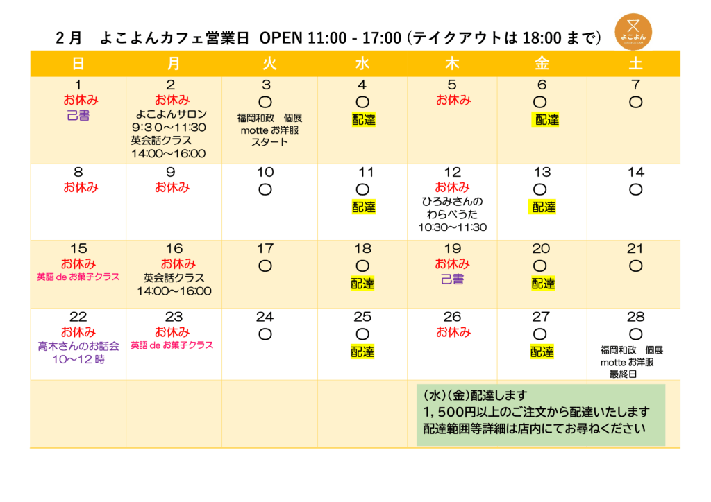 【2月の営業カレンダー】